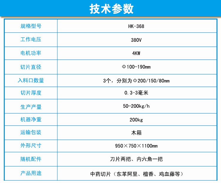 一、产品介绍: 1.HK-368切片机需配备380V工业用电,不适合药店、诊所、家庭等,仅适用于小型药厂以及食品厂等行业。