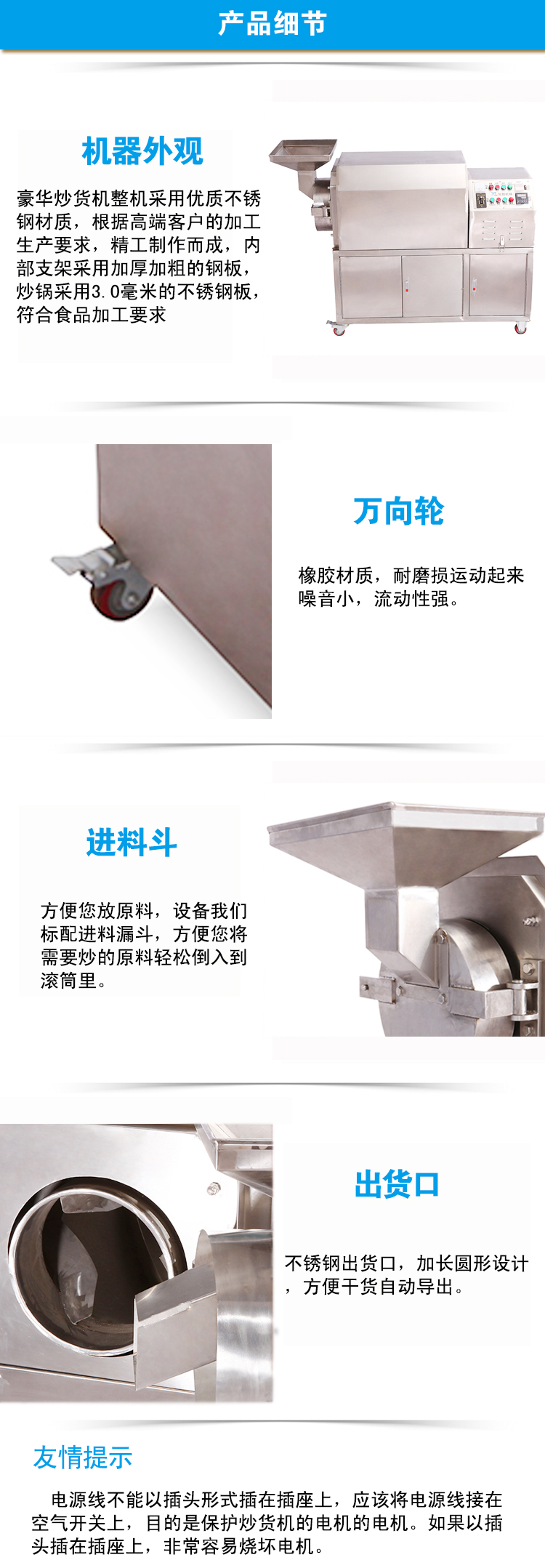 内部支架采用加厚加粗的钢板,炒锅采用3.0毫米的不锈钢板,符合食品加工要求。配高端电器元器件,整机外观豪华高 档,运转平稳,加热迅速均匀,炒货效果一流,是市面上最高档、最好用的豪华炒货机。本着服务广大客户的宗旨,价 格不高!方便、实用、高效! ![]() ![]() ![]() ![]() 1.开云(中国)一站式服务官方网站_开云体育官方网站最新推出的豪华炒货机采用优质不锈钢材质,独特的滚筒卧式结构,加热均匀,密封性好,焖炒效果特别好。同时