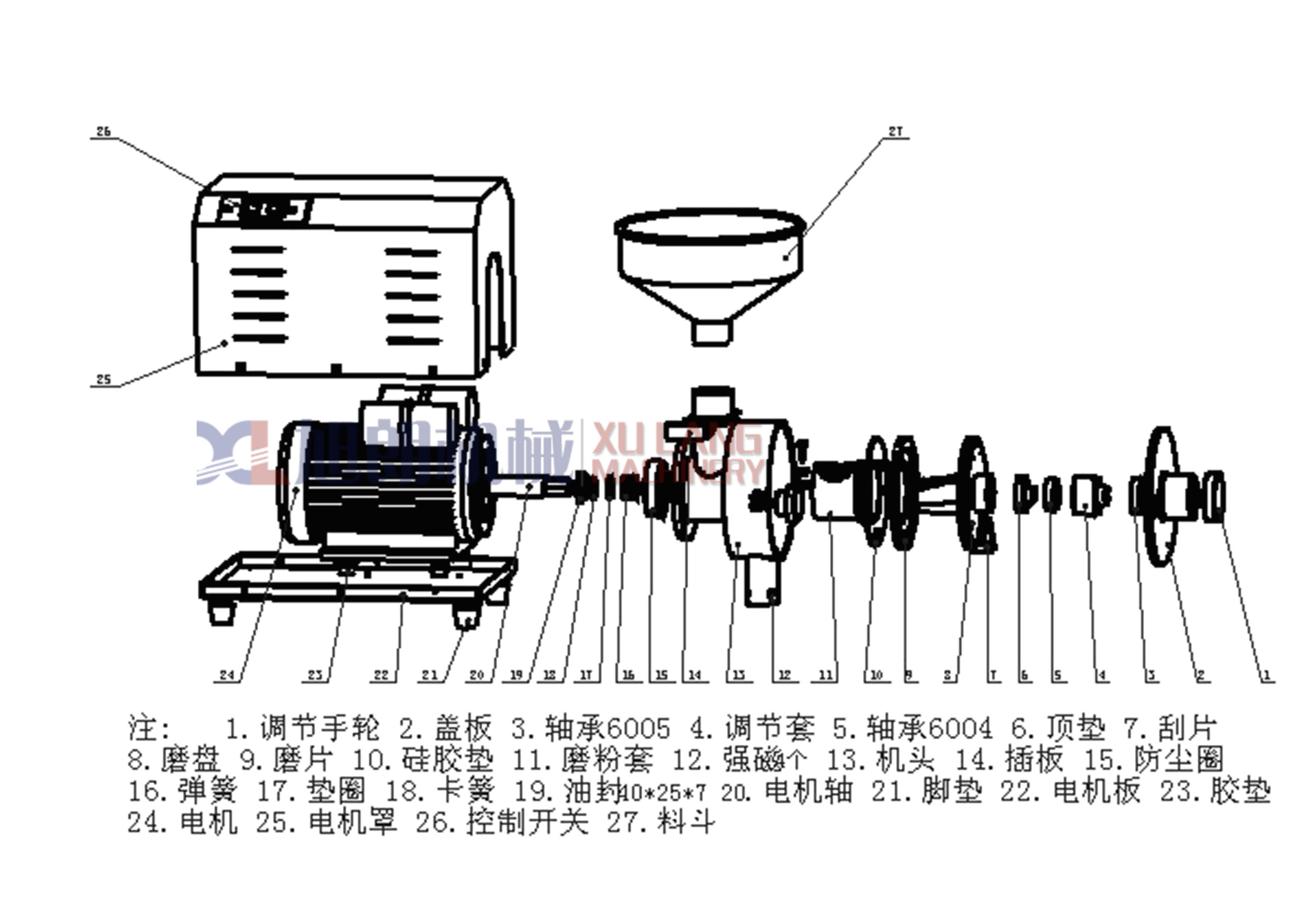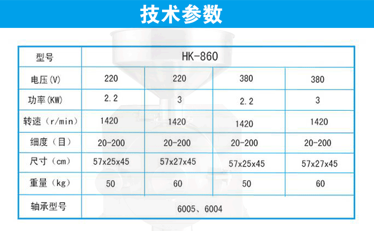 HK-860开云·体育分解示意图 ![]() ![]() ![]() ![]() 一.860开云·体育优势说明: 1、 860磨粉机不再采用低功率电机,220V有2.2和3KW两个功率,380V仅有2.4KW一个功率。新款磨粉机的电 2、 静磨片与机壁之间加装了硅胶垫,起到减震、微调磨片的效果,使两块磨片吻合更好,磨粉更细,噪音减弱。 3、 860磨粉机,电机与电机固定板之间,电机固定板底下,均加装橡胶垫,进一步加强减震和降噪效果。 4、 860磨粉机门盖和腔体之间,采用紧密加工方式,以台阶位配合方式,确保不漏粉,确保调节器顶垫和磨 5、 860磨粉机的粉碎腔坡度(即静磨片安装位),采用科学设计,进一步保证了磨粉的细腻度,达到进口即 6、 860磨粉机的调节器槽牙,采用高级机械加工中心,确保加工精密度,达到了方便调节、配合紧密、噪音 7、 磨粉机的磨盘装上磨片和刮片后,经过电脑动平衡检测,进一步保证了同心度和重心的平衡度, 8、860磨粉机的底座和电机之间没有轴承,便于客户拆装,又减少了故障发生,提升了机器品质。 9、磨粉机达到了出料顺畅、磨粉非常细腻、噪音和震动比老款小很多的效果。 860磨粉机,每台均配送价值200元的大礼包,含2副磨片(机器上本身自带1副)、不锈钢下料棒1根、 磨粉机的电机启动运转时,连接轴以及套在连接轴上的磨盘一起运转。待磨物料从料斗进入磨粉套,磨盘 三.技术参数 四.操作与调整 1、磨粉机应放置在水平、固定、结实的水平桌面或者台面上,厚实木更佳。 2、由于磨粉机电机在工作后会不断产生热量,所以磨粉机应放在宽敞通风处,有利于散热降温。如果 3、将机盖打开,再将磨盘固定在连接轴上,再用两个大拇指按压在磨盘上,如果磨盘能够自由伸缩,说 4、启动电源,运转1分钟左右,将物料放进料斗,将调节器拧至适当位置,打开下料挡板,使物料缓慢地 5、 磨粉的粗细取决于两块磨片之间的间隙,而磨片的间隙靠调节器进行控制,根据机盖上的粗细指示, 6、调节器的调节范围和力度该如何控制,可以通过耳朵听磨片摩擦产生的声音以及电机运转的声音来决 7、单独磨含油量特别高的物料如芝麻、核桃、花生等,因为这类物料的含油量特别高,只能磨成粗粉, 8、动磨片和静磨片的装卸:装在磨盘上的为动磨片,装在粉碎腔的为静磨片。将固定磨片的3枚螺丝取下 五.注意事项 1、使用前详细阅读使用说明书,严格按照操作规范操作机器,每次开机前,应检查静磨片、动磨片、刮片 2、磨粉机一定要外接断路保护(过载保护)装置,以保护电机和人身安全。 3、加工五谷杂粮、中药材等,应先烘干或烘熟,清除石块、金属等杂物。物料受潮变软或者发粘后,应该 4、每次使用机器结束后,应将机器内部清理干净,不得用水直接冲洗,并通风晾干。 5、严格按照规定接地线,电机应以逆时针方向运转,机器正常运转无异常、无异动、无异响时,方可操作 6、磨粉机需固定在牢固稳定水平的桌面和柜台上,才能最大地减轻震动和噪音。 7、在加工过程中,如因停电等原因突然停机,必须先关闭电源开关,再清除粉碎腔内的残余物料后,才能再 8、如发现机器零件有严重磨损或损坏时应及时进行修理或更换。 9、机器启动后,应待运转正常时才能放料加工,注意控制进料量,防止电机超载闷机。 10、机器较长时间不用时,应切断外电源,机器勿到置,要平放,上面不要放重物。 11、本机保修一年,人为使用不当引起的损坏,以及正常磨损,不属保修范围。需返回销售单位或者厂家进行 六.操作方法和技巧 (一)、操作方法 1、机器每天使用前必须检查机器是否运转正常、静磨片和动磨片的螺丝是否有松动,并加以拧紧。 2、磨干性材料 磨干性材料是需要磨两次,第一次粗磨,第二次细磨。 第一次粗磨时,调节调节螺丝至磨片有轻微的吱吱摩擦声音,再往粗回调节到刚刚没有摩擦声,然后打 3、磨干性加油性混合材料 方法一 磨干性加油性混合材料时需要磨两次,第一次粗磨,第二次细磨。 第一次粗磨时,调节调节螺丝至磨片有轻微的吱吱摩擦声音,再往粗回调节调节螺丝一圈,然后完全打开 第二次细磨时,调节调节螺丝至磨片有轻微的吱吱摩擦声音再打开下料口插版1/4-1/3即可。 方法二 第一次将干性材料细磨(与磨干性材料操作方法一样)。 第二次将已经磨好的干性材料与油性材料混合均匀,在调节调节螺丝至磨片有轻微的吱吱摩擦声音,然后 4、磨含糖份高的材料 磨含糖份高的材料时,(比如红枣、金桔片、枸杞等等)糖份高的材料需烘焙干,去水份,或速冻两个小时 5、磨含糖份高的混合材料,操作方法和磨干性加油性混合材料操作方法相同。 (二)、更换磨片 1、拆下旧磨片(磨片有正反面,静磨片和动磨片可以调换使用)。 2、安装好磨片,调整磨片内孔与粉碎套或动磨盘安装位置的缝隙均匀再拧紧螺丝。 3、调节磨片的平整:开启机器,调节调节螺丝至磨片发出非常刺耳的声音,运行20-30秒钟左右,停机打开 (三)、磨合磨片 1、取2-3斤大米放入漏斗,启动机器调节调节螺丝至磨片刚刚有轻微的吱吱摩擦声音,再往细调节调节螺丝 七.常见故障及排除方法 故障现象 故障原因 排除方法 电机不能启动或启动困难 导线直径小,电压过低电容损坏 更换适当导线待恢复电压后再启动 电机无力 温度台高 电机绕组短路或电机轴承损坏,长期超负荷运转 检修电机,更换电机轴承,按额定负荷工作或暂停 机身发生 强烈震动 其它零件重量不